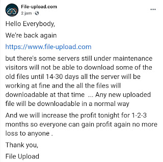 Di baca sendiri informasi nya dari file-upload.com pada halaman Facebook mereka, klik link ini : https://web.facebook.com/fileuploadcom