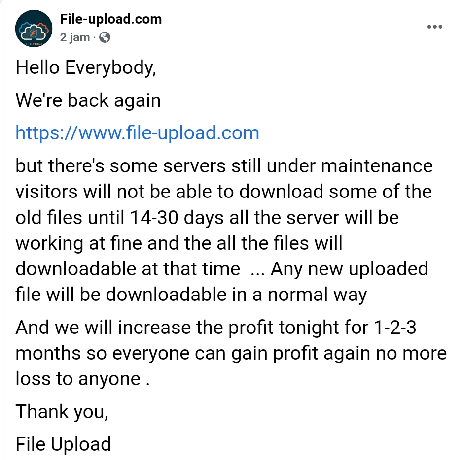 Silahkan cek lewat Facebook mereka di https://web.facebook.com/fileuploadcom